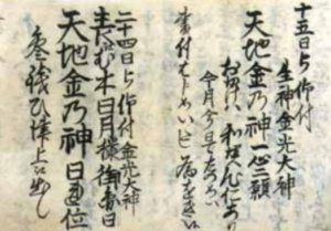 After the Meiji Restoration of 1868, the new government’s religious policies restricted Konkokyo teachings because Tenchi Kane no Kami was not recognized as a formal deity in the Kojiki, which defined the only deities permitted for worship and shrine establishment during the Meiji era. The Kojiki itself is a text documenting the history and mythology of Shinto.